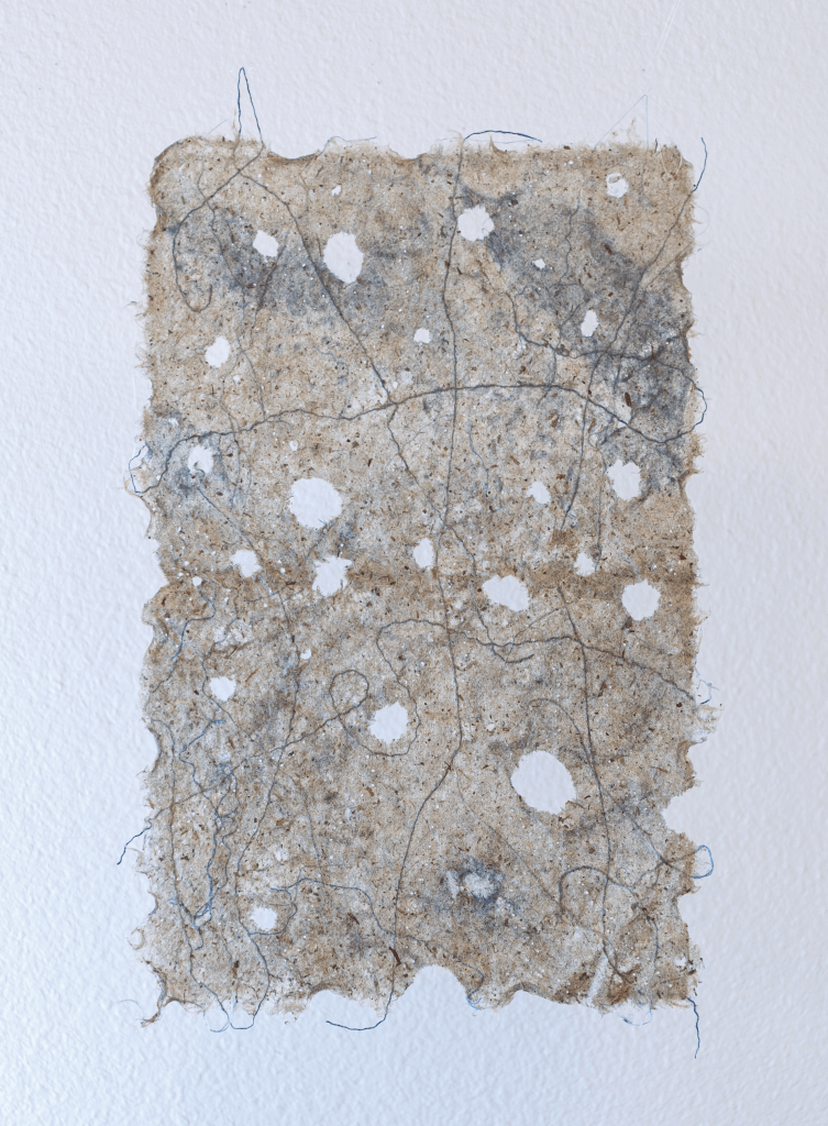Jane Ingram Alle, “Cosmos”, handmade paper from plants of Costa Rica, holes, thread, dye, gel,