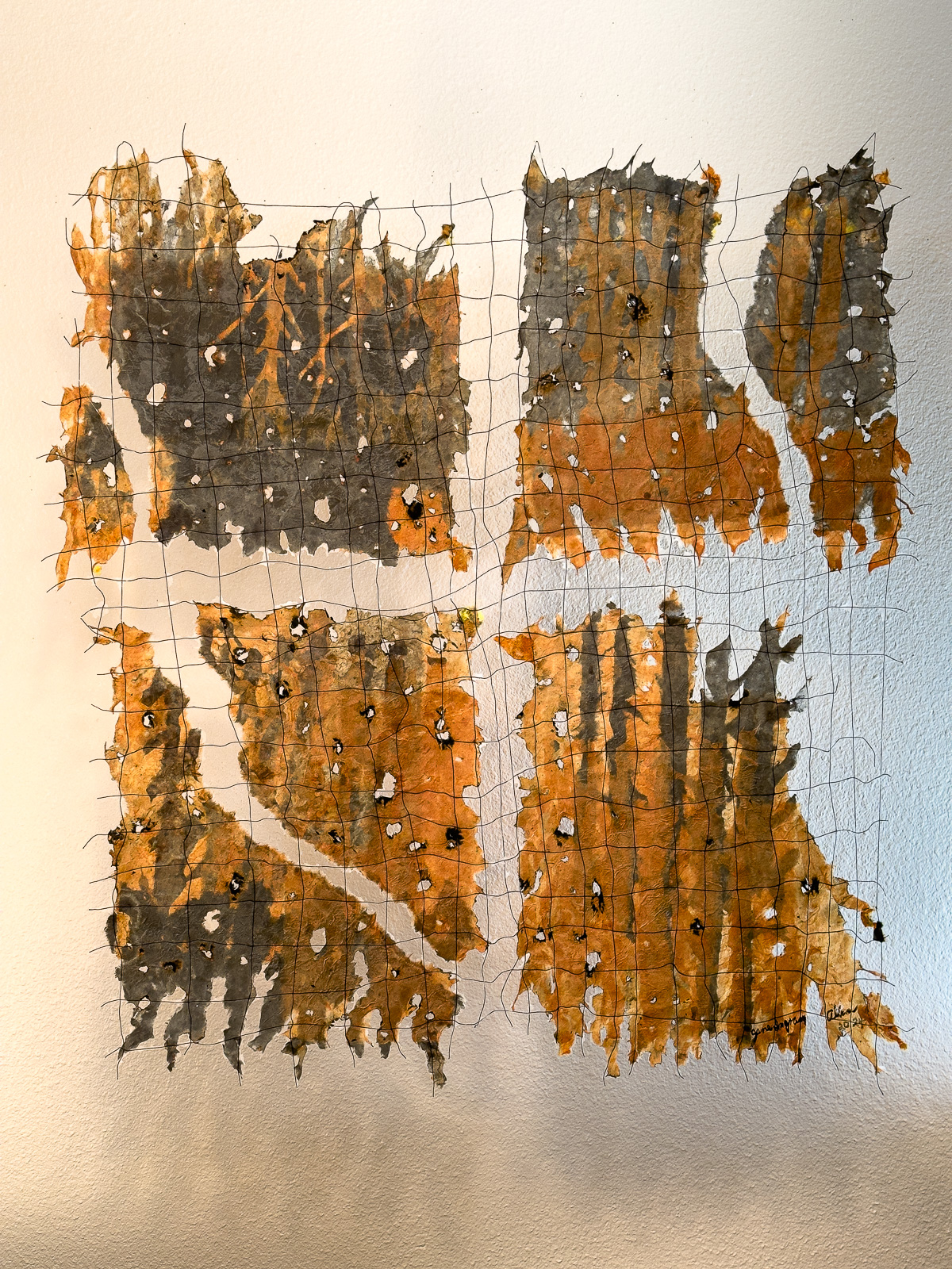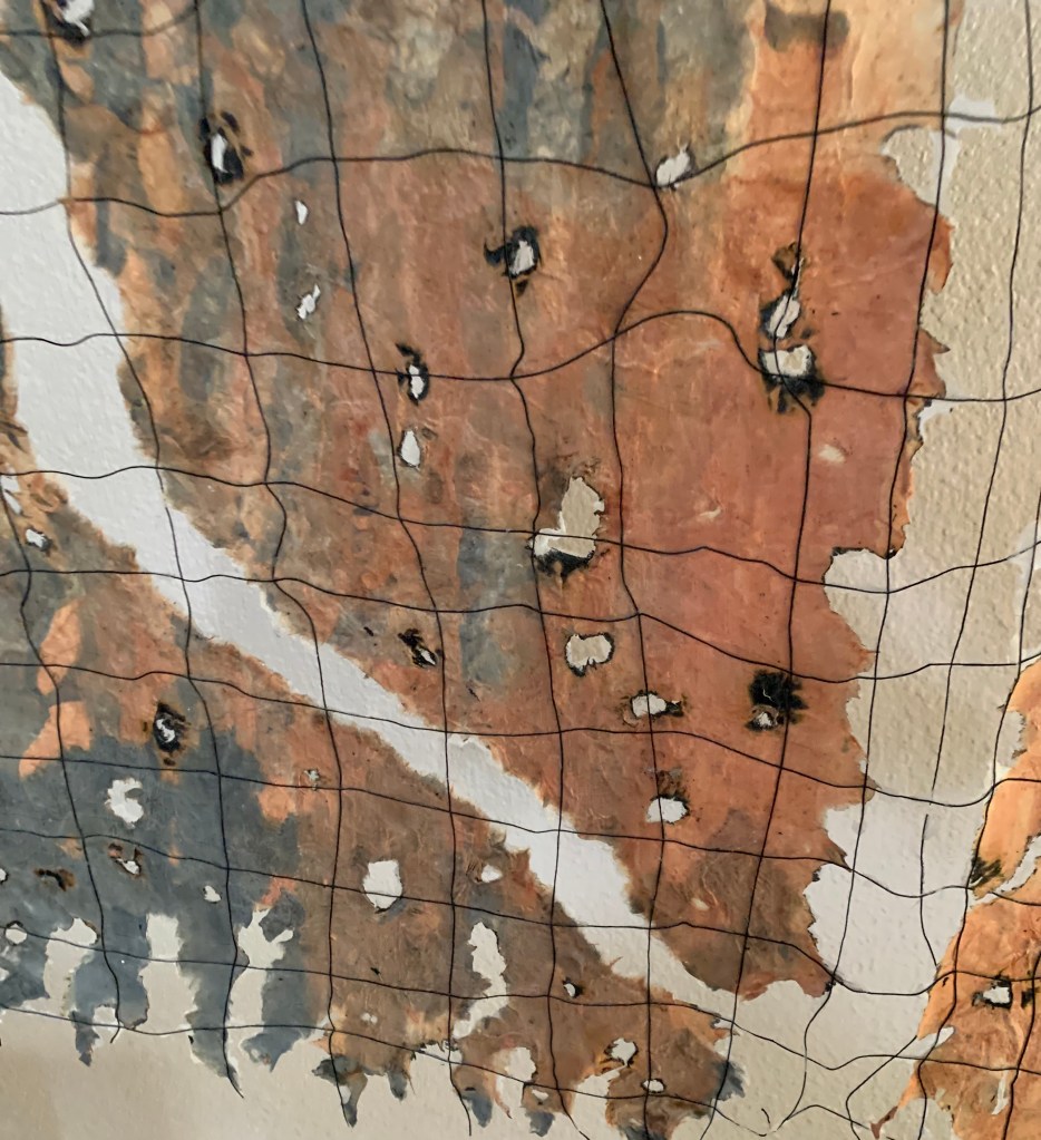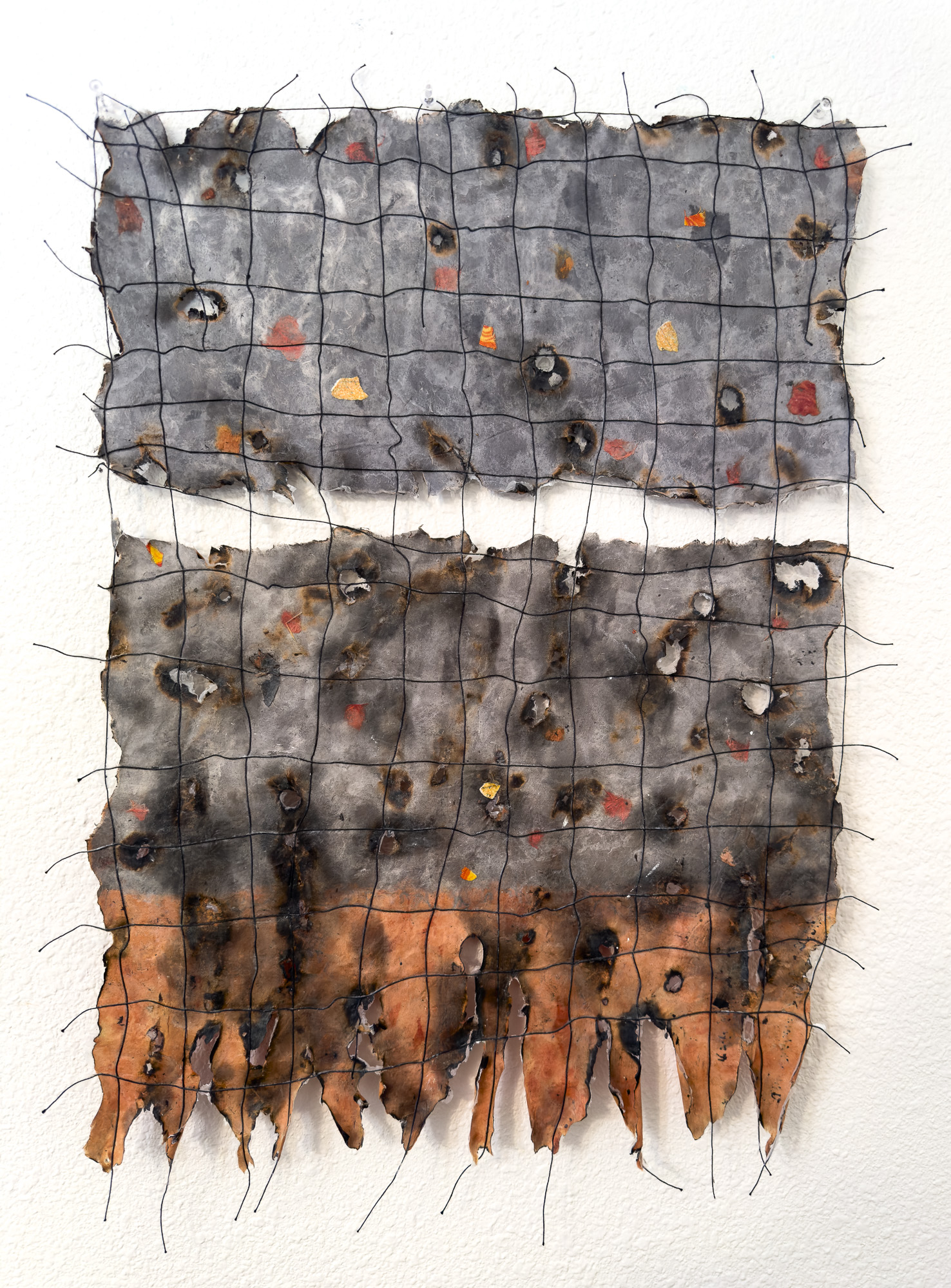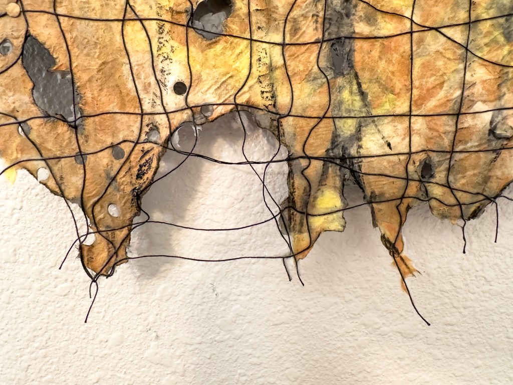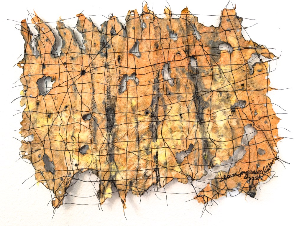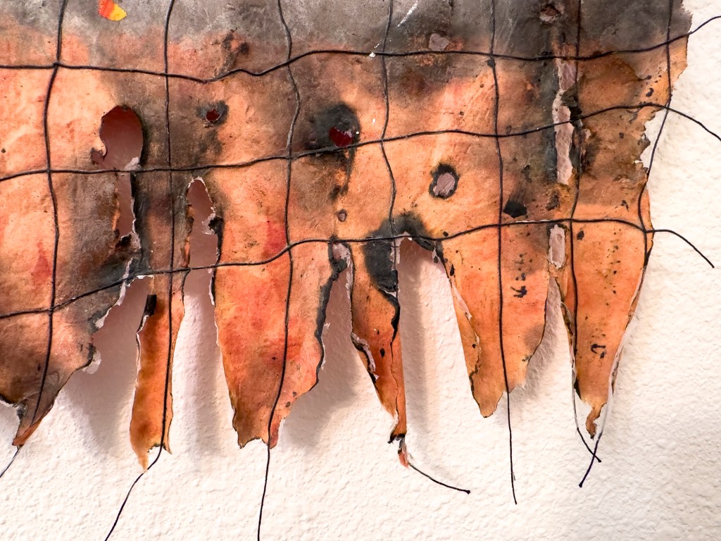 One of 80+ handmade paper artworks in this exhibition, Fire and Water 6, 36 x 24 inches, handmade kozo and abaca paper, dye, thread, acrylic gel, holes and controlled burning, made in Santa Rosa, CA, 2025.