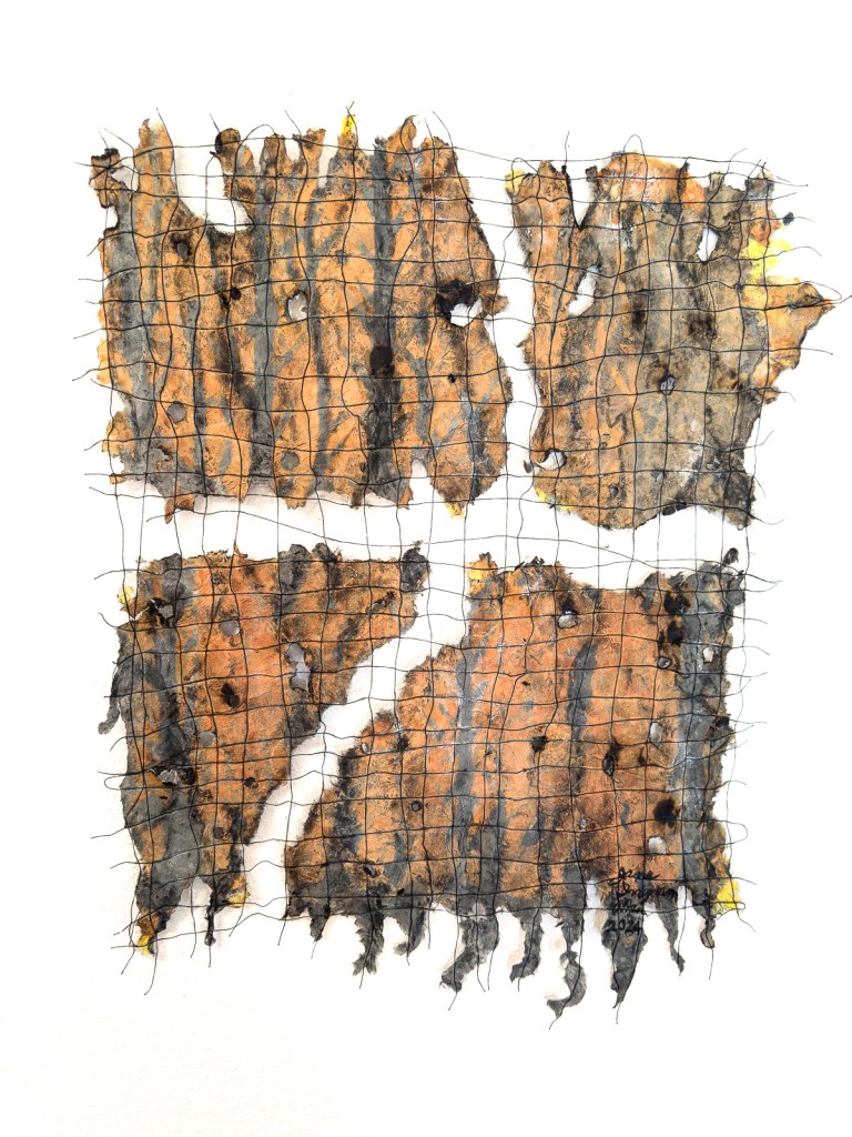 My new Series “Fire and Water” continues.  My handmade paper series of works in 2024 using handmade paper, stencils, dye, burning and hole making continues with another piece that features burned tree trunks and orange and smoky blue handmade paper.  This work, #5 in the series, is about 4 feet square and hangs suspended in space to experience the holes and the translucent kozo fiber handmade paper.