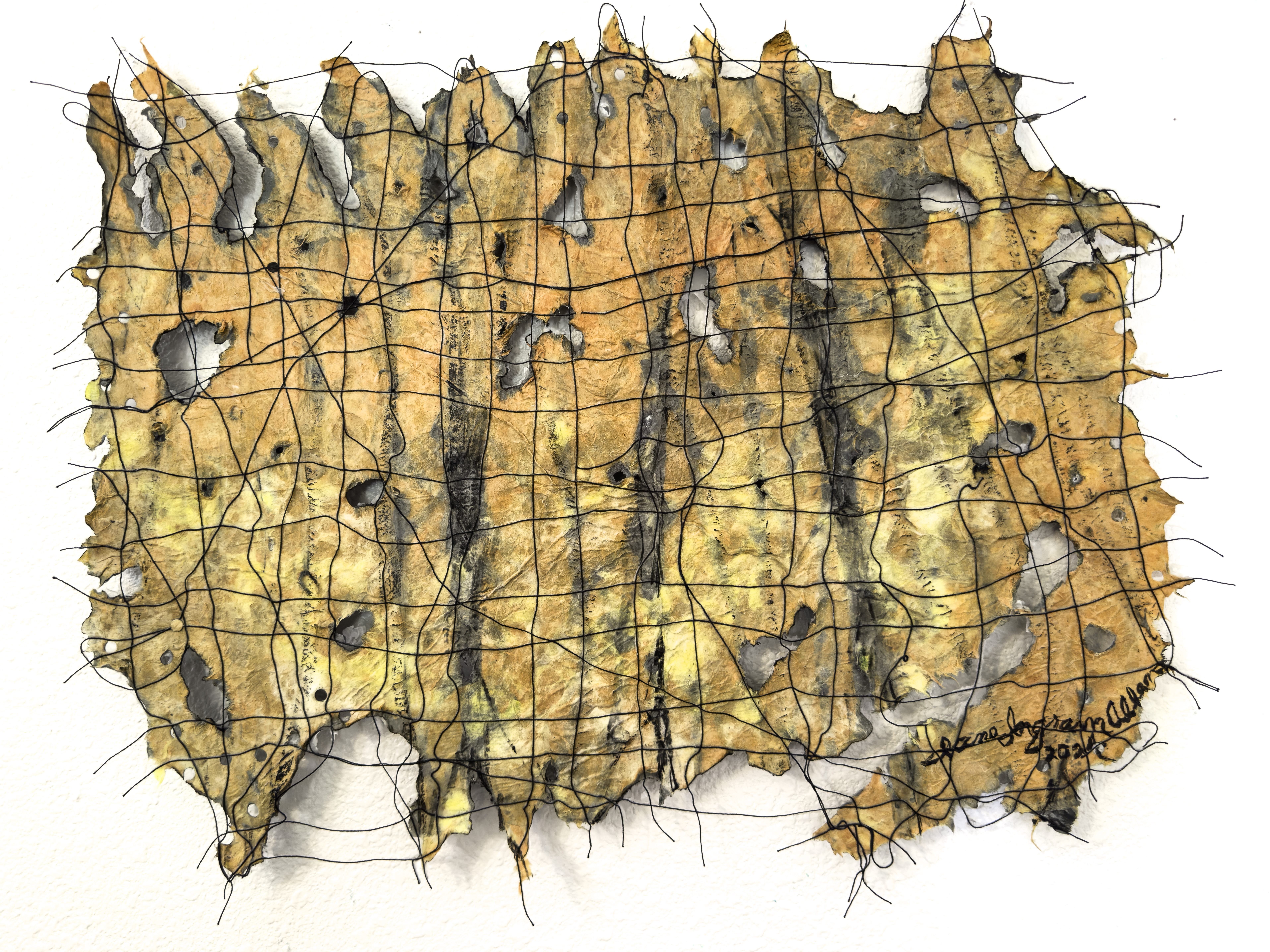 Jane Ingram Allen, “Fire and Water 4 – Yellow Hot”, 2024, artist-made kozo and abaca fiber handmade paper, dye, acrylic paint, thread, burning, 18 x 22 inches, photo by Timothy S. Allen.