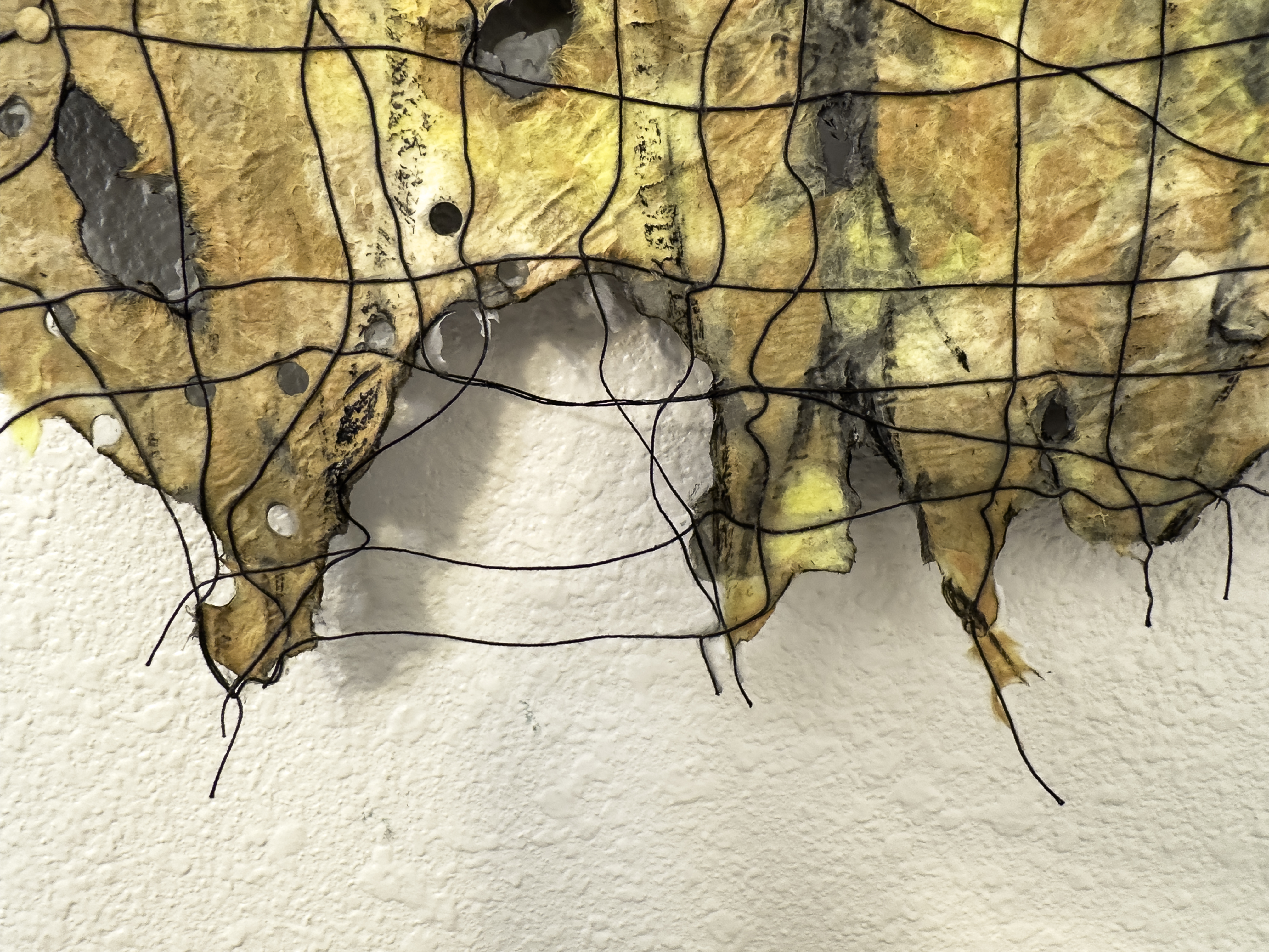 I use controlled burning of my handmade paper and natural fiber constructions to make unique patterns, holes and colors in the handmade paper I create using Japanese techniques and my own papermaking innovations.  The works hang suspended from the ceiling and the transparent paper and holes look great with light coming through. This work emphasizes that fire can be beneficial, beautiful, purifying and warming as well as destructive and terrifying. I feel that seeking harmony with nature should be our goal to help mitigate climate change effects and work together for a better environment.
