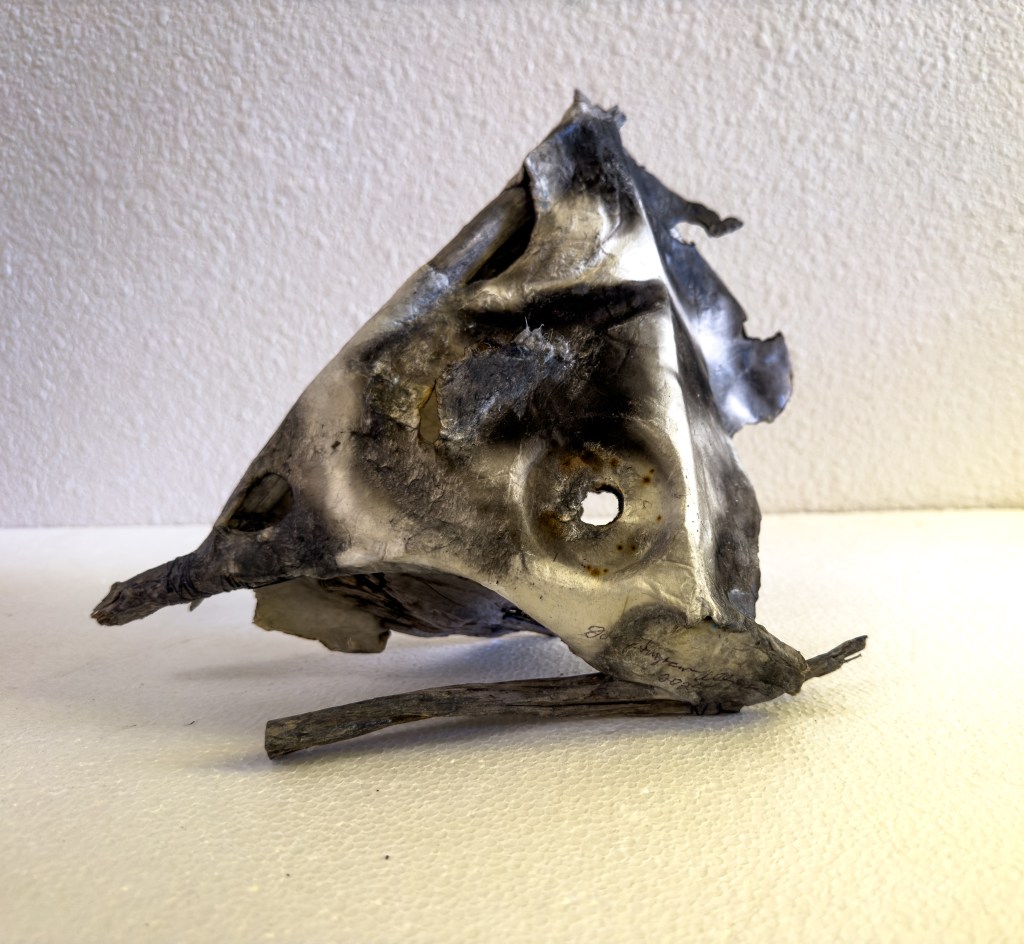 Small Sculpture by Jane Ingram Allen with Twigs and Burned handmade paper dried on rusty washer.