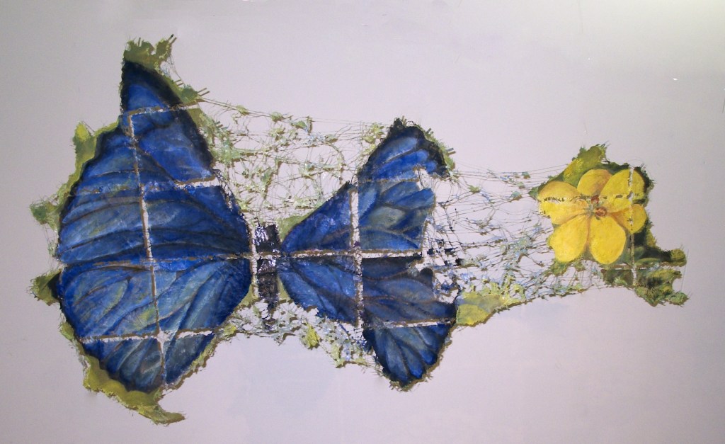Jane Ingram Allen, Kinmen Site Map – Blue Butterfly, 48 x 75 inches, two-sided, handmade paper from plants of Kinmen, thread, acrylic paint and gel, other materials collected on Kinmen, made in Kinmen, Taiwan, 2005