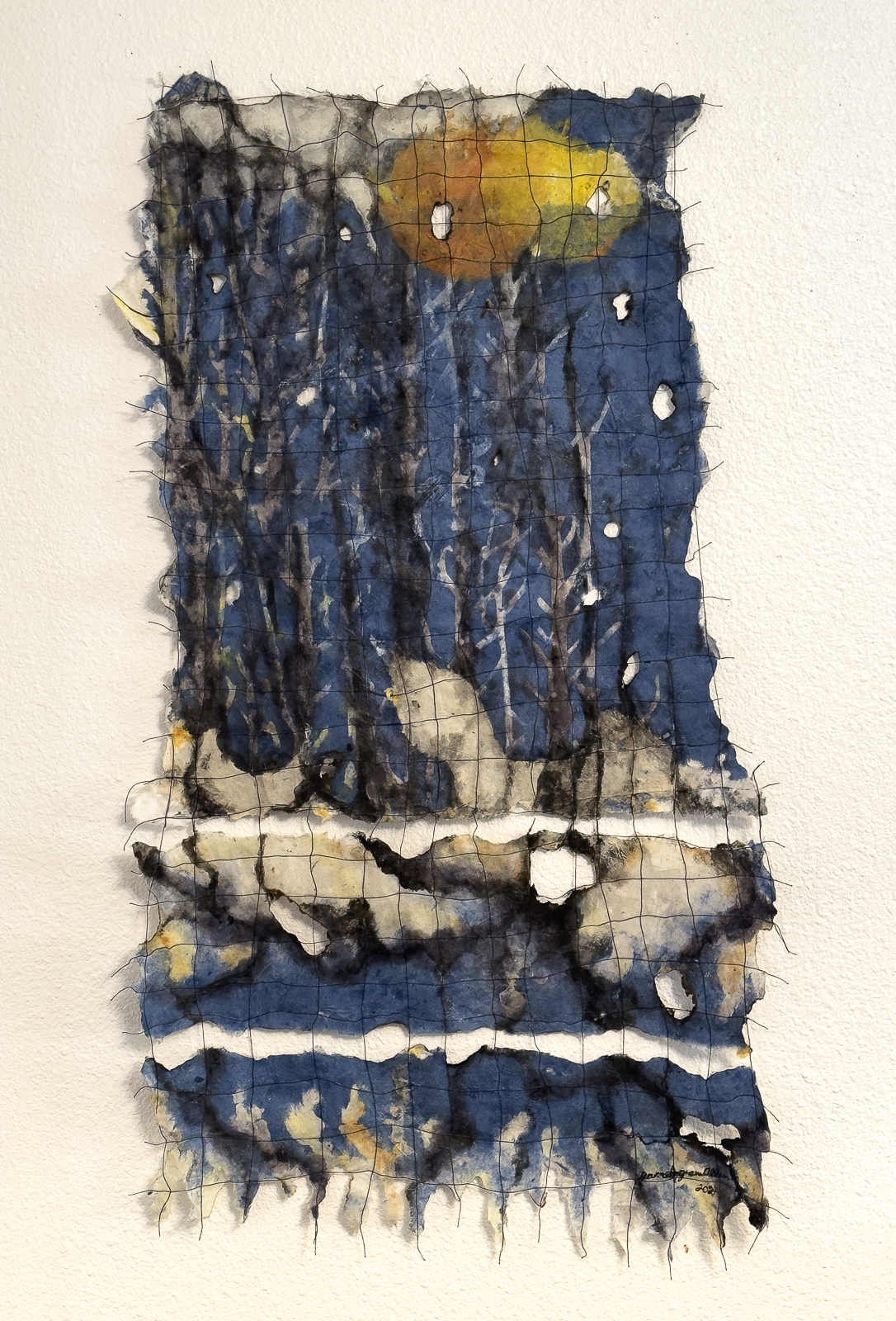 Jane Ingram Allen, “Fire and Water 3 – Burned Trees”, 2024, artist-made kozo and abaca fiber handmade paper, dye, acrylic paint, thread, burning, 34 x 24 inches, photo by Timothy S. Allen.