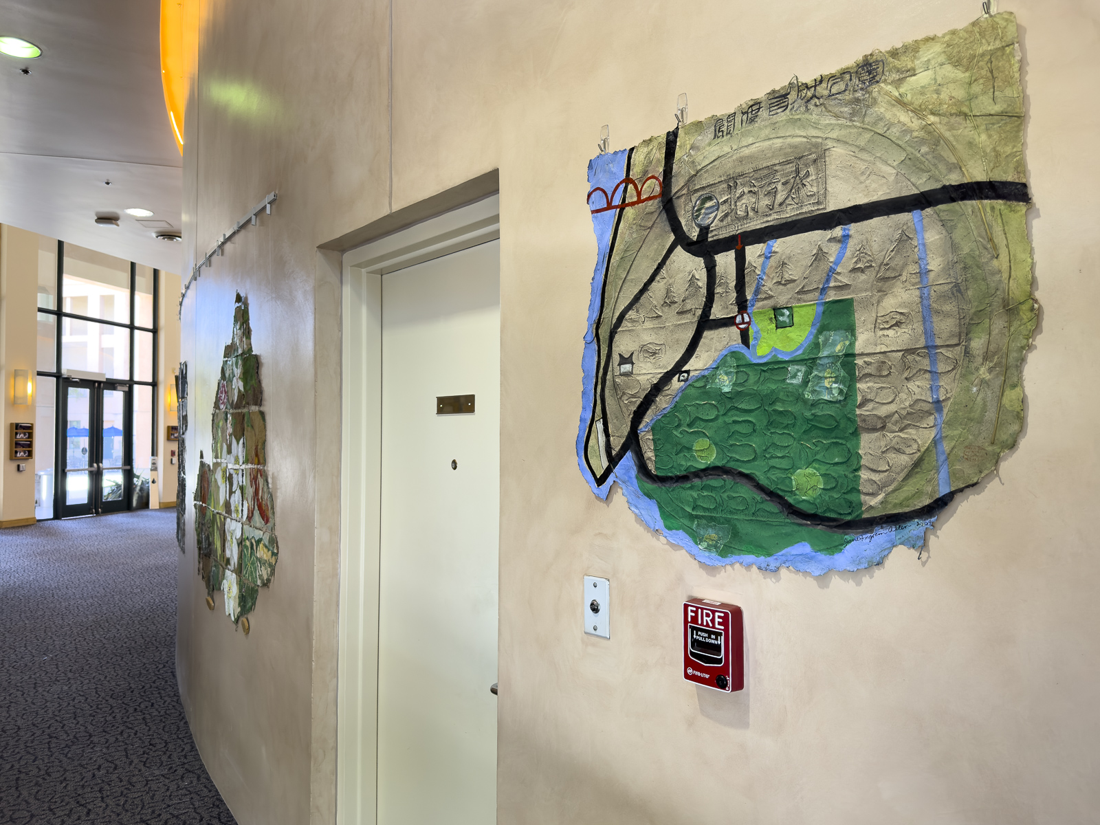 Chiayi Site Map, 2005, 35 x 78 inches, mixed media, handmade paper from plants of Chiayi County, Taiwan, thread, acrylic paint and gel, other items collected in Chiayi, part of my “Made In Taiwan” Fulbright Scholar research grant project.