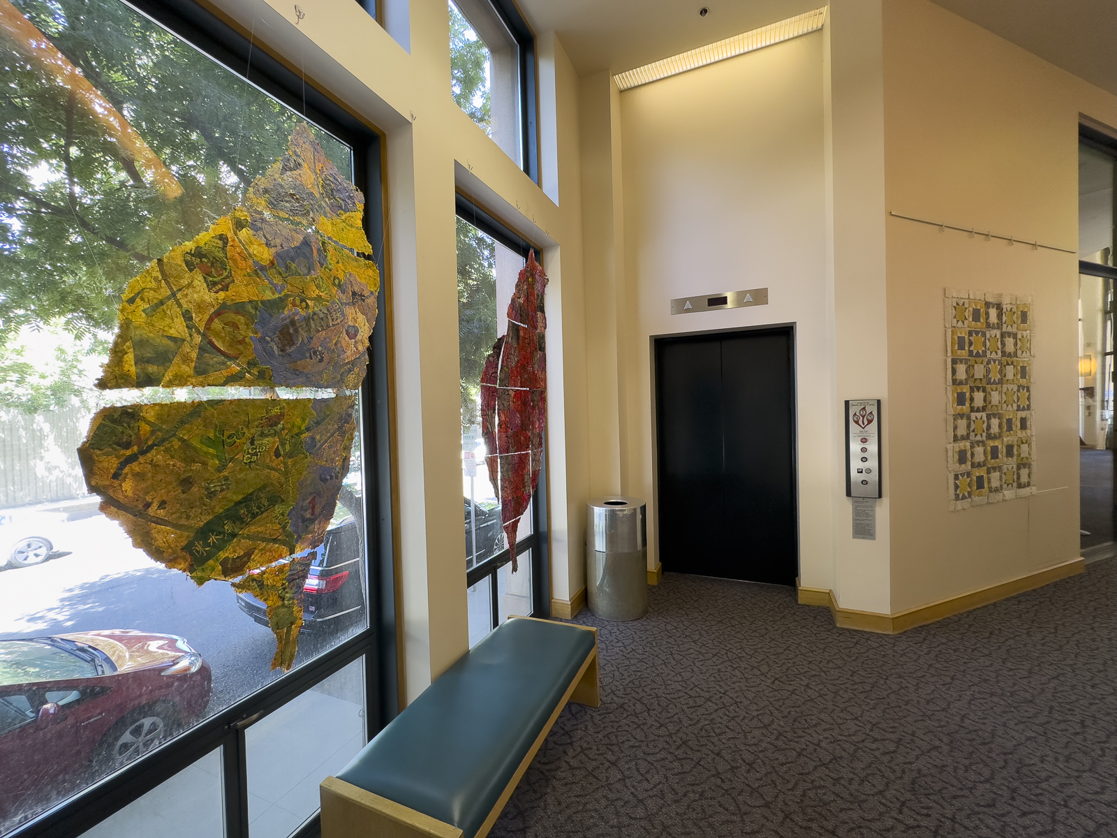 New Collaboration Feeling the Heat with printmaking artist Jami Taback is in progress. Jami and I are calling this new multi-part eco-art installation “Feeling the Heat”, and it is focused on environmental issues related to fire, global warming and climate change, using handmade paper, thread, dye, controlled burning and printmaking. The project is an extension of our “In Deep Water” collaborative project begun in 2020 and exhibited at 5 non-profit venues in Northern California, NJ and NY as well as one foundation gallery in Taiwan. Our In Deep Water Project was supported by grants from the Foundation for Contemporary Arts, the Puffin Foundation and Live Forever Foundation, Taiwan. This time the collaboration is via Zoom and shipping parts back and forth between PA where Jami now lives and Santa Rosa, CA, where I continue to be based. We expect to premier this new installation either in Northern CA or in the Northeastern US in late 2026 or early 2027. We are actively seeking venues to exhibit this work and also applying for grants and other support. This “Feeling the Heat” installation will feature multiple swirling panels with fire imagery and hand papermaking and printmaking joined by threads and suspended from the ceiling in site-specific installations by the artists. Public programs and hands-on workshops will be offered at each venue. Keep watching for more news and photos of this in-progress large-scale eco-art collaborative installation.